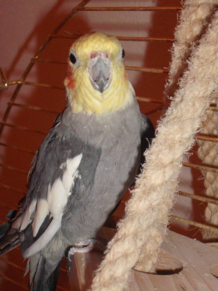 Am 18.3.2006 kam Fussel zu mir. Seine Vorgeschichte kennt niemand. Nach Merlins Tod im Oktober 2005 habe ich lange gesucht. Ich wollte wieder einen absoluten Notfall bei mir aufnehmen. Gleichzeitig hatte ich aber das Problem, dass Roberto sehr schwierig ist. Der einzige Vogel, mit dem er sich richtig gut verstanden hat, war Merlin. Mit Hilfe verschiedener Internetanfragen bekam ich eine e-mail von Gudrun Capeller von der Sittich-SOS, wo ich auch angefragt hatte. Sie hat Verbindung zur Vogelnotstelle in Ratingen und da sass Fussel. Für Interessierte: www.sittich-sos.de Von einem Tierheim in Hamburg vermittelt, weiss niemand so genau, was er alles durchgemacht hat. Er ist ein Federfresser, das heisst, er hat sich alle Federkiele so zerbissen, dass er nicht mehr fliegen kann. Kurz und gut, es hat alles wunderbar geklappt. Er ist das fröhlichste Wesen, dass ich je erlebt habe. Er pfeift, zwitschert und baggert alles und jeden an und strahlt soviel Frohsinn aus, dass man gar nicht meinen soll, dass er so viel mitgemacht hat. Das Foto oben ist von Ende Mai 2006 und es ist erstaunlich, aber er hat wieder einen Federflaum am Körper. Als er im März zu mir kam war er völlig nackt. Ich denke, die nun folgenden Bilder sprechen für sich, wie schlimm er aussah, als er zu mir kam und auch dafür, was falsche Haltung bei einem Nymphensittich anrichten kann. Ich jedenfalls werde dafür Sorge tragen, dass er den Rest seines Lebens (Alter unbekannt) bei mir und den Jungs glücklich sein kann. Er hat augenscheinlich genug Schlimmes erlebt ! Auf dem folgenden Foto ist er noch in der Vogelnotstelle in Ratingen :